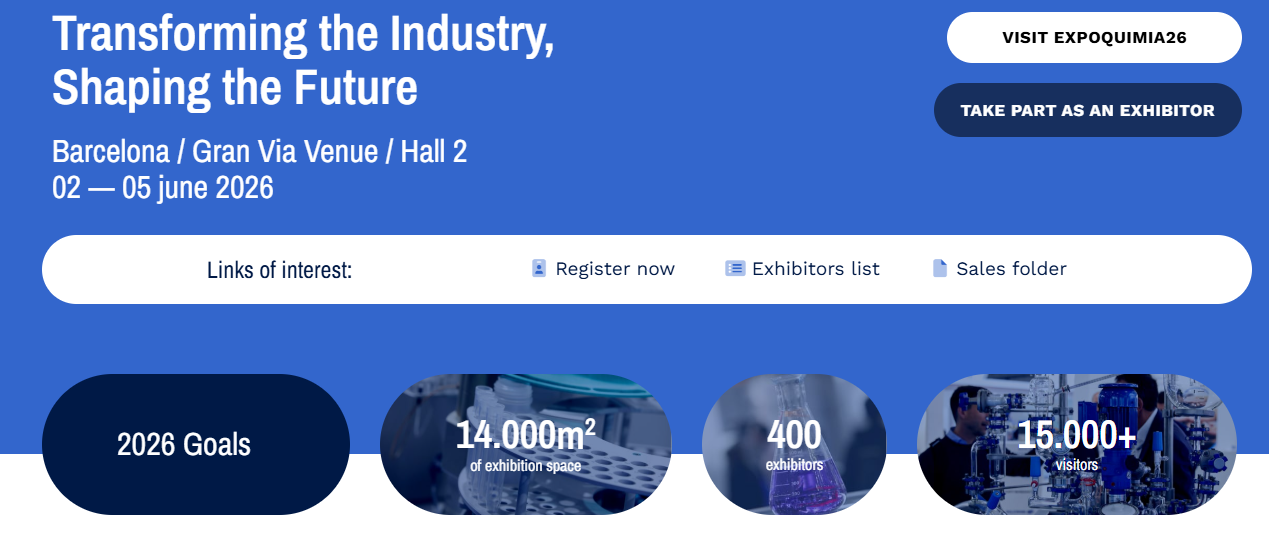 Expoquimia是欧洲最重要的化工行业展览会之一,拥有超过50年历史。展会聚焦化工技术、设备、原材料、化学品等领域。通常每届吸引来自欧洲及全球的800家参展商和30,000多名专业观众。主要展品和展区包括化工设备、过程控制、实验室技术、化学品、原材料、环保技术等。巴塞罗那是欧洲重要的工业城市,对中国化工企业而言,该展会是进入欧洲市场的良好平台。2026年展会具体时间待公布。